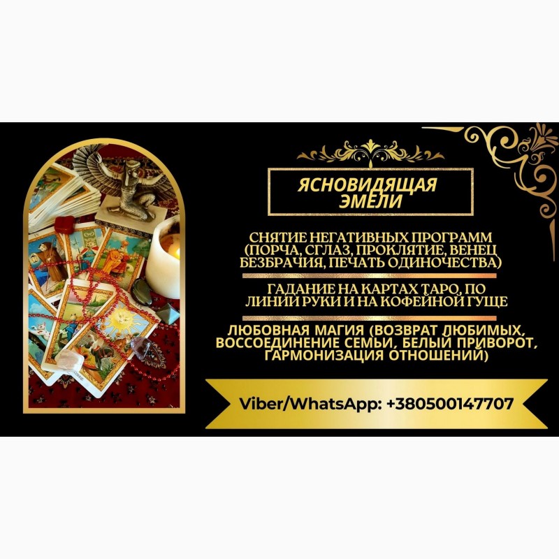 - Гадание на картах Таро, по линии руки и на кофейной гуще. Узнайте, что ждёт вас в будущем, и получите полезные советы для принятия правильных решений. Эмели гадает как лично, так и дистанционно через Viber/WhatsApp: +380500147707.