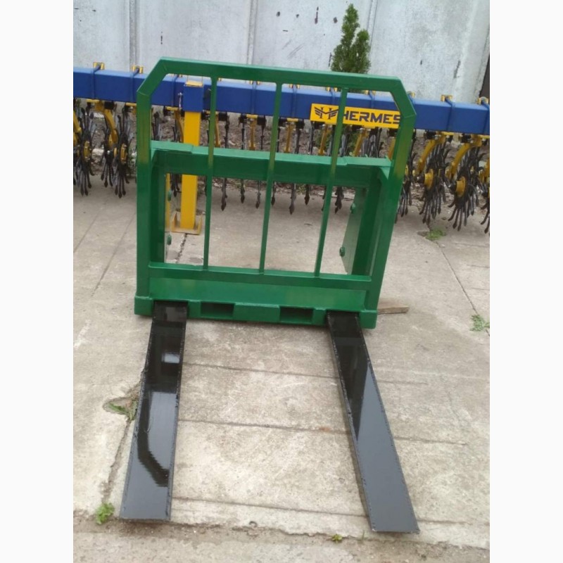 Вила для піддонів (паллетні) Основні технічні характеристики вил: агрегатуються із фронтальними навантажувачами тракторів МТЗ, ЮМЗ, Т-40; ширина вил – 0.9 м; глибина захвату – 1.2 м; вантажопідйомність – 800 кг; маса вил – 120 кг.