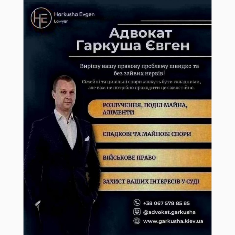 Вітаю! Мене звати Євген Гаркуша, і я – адвокат із понад 15-річним досвідом у сфері сімейного, цивільного та військового права.
