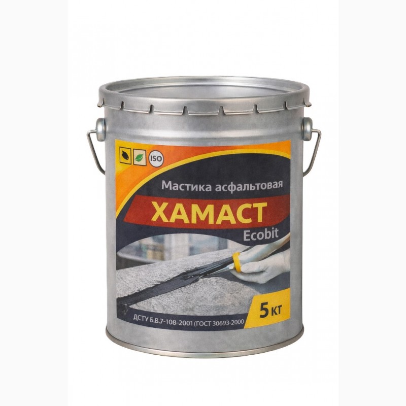 Мастика асфальтовая ХАМАСТ ЭКОБИТ ведро 5,0 кг ДСТУ Б.В.2.7-108-2001 (ГОСТ 30693-2000) Представляет собой однородную массу черного цвета, состоящую из битумного вяжущего (битум мягкий, битум твердый) и минерального наполнителя (мел, цемент, асбест и специальные добавки ингибиторы коррозии).