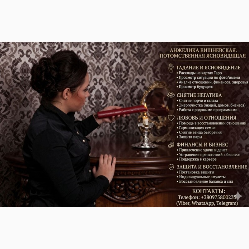 Ясновидящая Анжелика Вишневская помогает найти источник проблем и безопасно устранить его. Работа ведётся индивидуально, без давления и пустых обещаний. Консультации возможны лично или дистанционно по фото.
