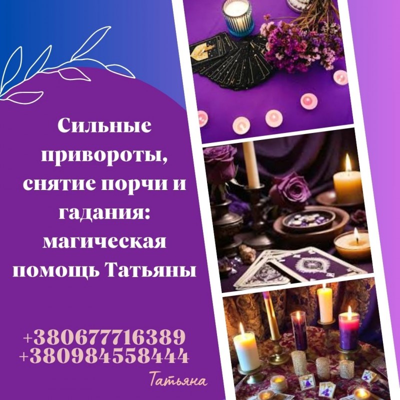 -Точные гадания и предсказания на будущее: Татьяна проводит точные гадания по картам Таро, которые помогут вам увидеть будущее и разобраться в текущих вопросах. Отношения, карьера, личные проблемы — Татьяна даст вам четкое понимание того, как действовать и что вас ждет.