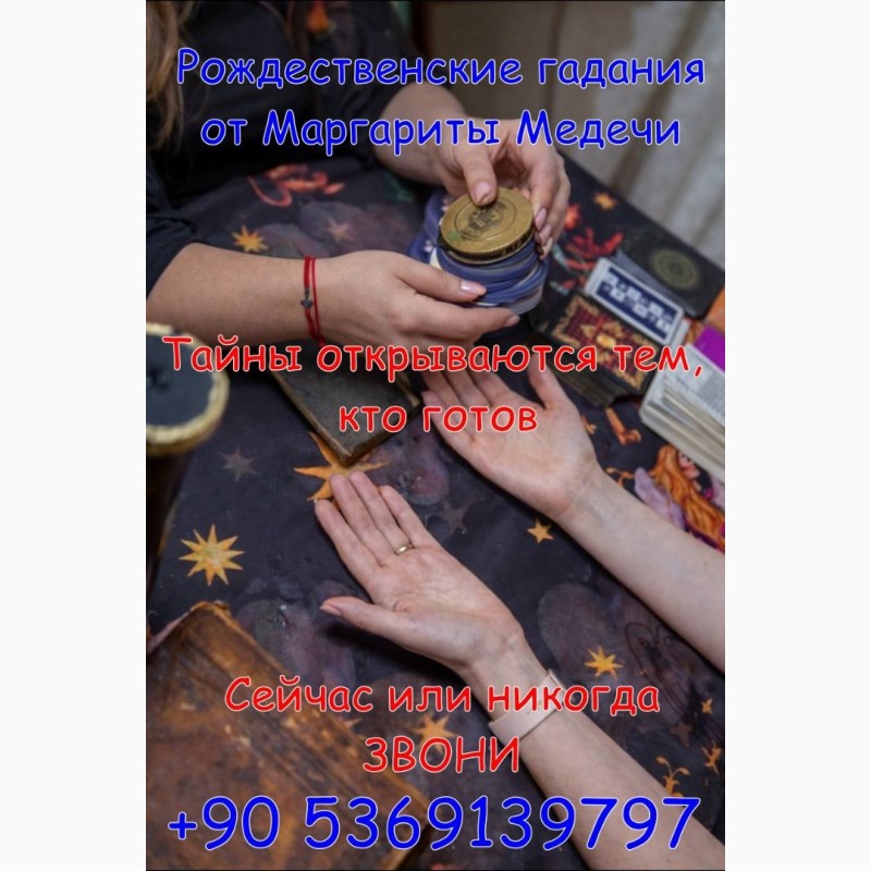 Маргарита проводит гадания на картах Таро, по кофейной гуще и линиям руки, которые позволяют увидеть ключевые события будущего, возможные препятствия и перспективы в любви, финансах и личной жизни. В новогодний и рождественский период такие гадания дают особенно глубокую и точную информацию.