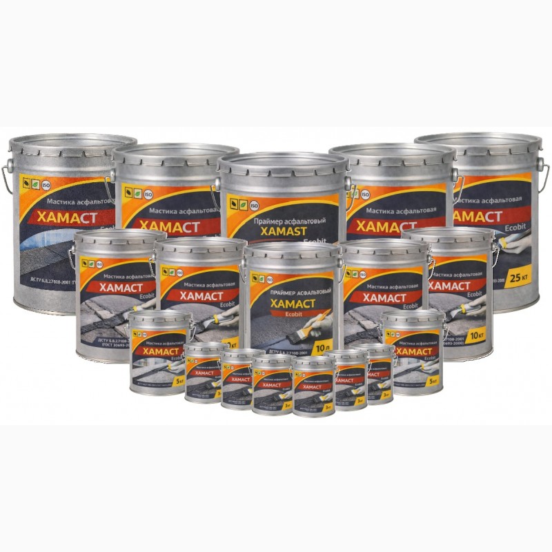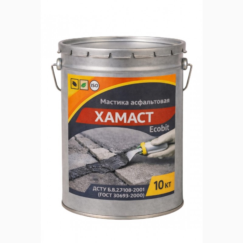 Мастика асфальтовая ХАМАСТ ЭКОБИТ ведро 10,0 кг ДСТУ Б.В.2.7-108-2001 (ГОСТ 30693-2000) Представляет собой однородную массу черного цвета, состоящую из битумного вяжущего (битум мягкий, битум твердый) и минерального наполнителя (мел, цемент, асбест и специальные добавки ингибиторы коррозии).