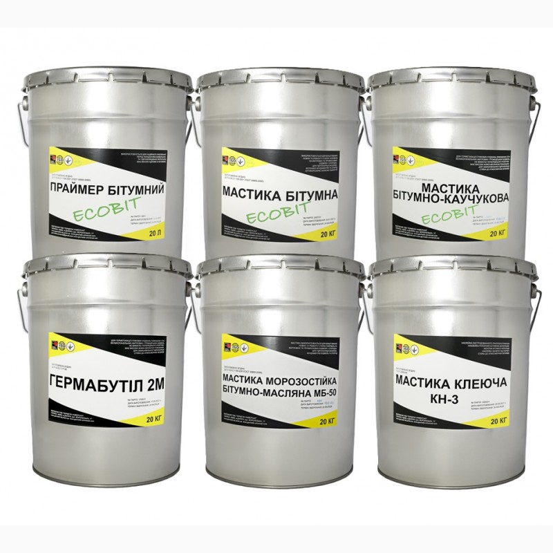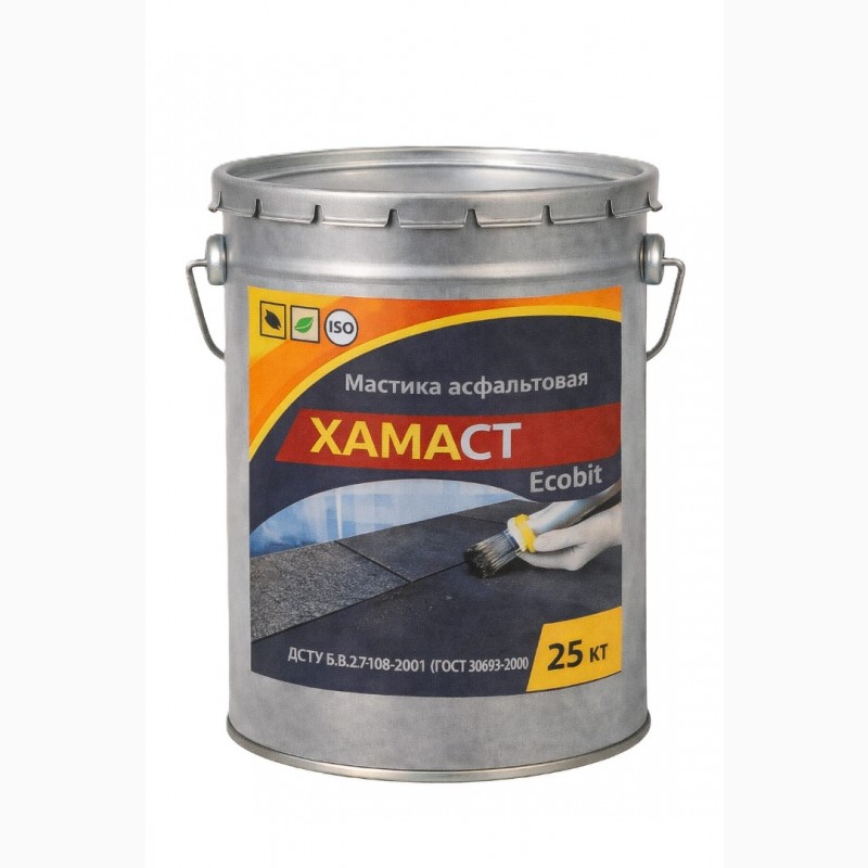 Мастика асфальтовая ХАМАСТ ЭКОБИТ ведро 25,0 кг ДСТУ Б.В.2.7-108-2001 (ГОСТ 30693-2000) Представляет собой однородную массу черного цвета, состоящую из битумного вяжущего (битум мягкий, битум твердый) и минерального наполнителя (мел, цемент, асбест и специальные добавки ингибиторы коррозии).